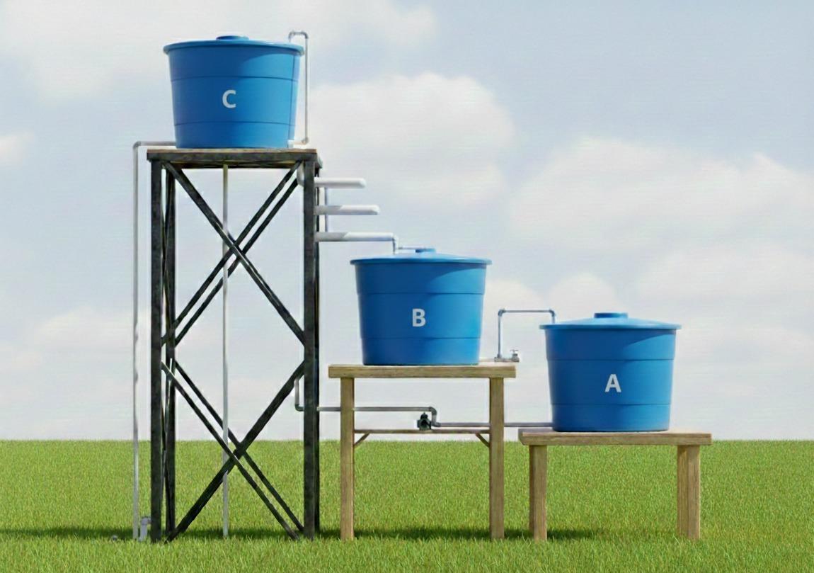 III) Três reservatórios de 10 mil litros para tratamento da água por filtro lento de areia;