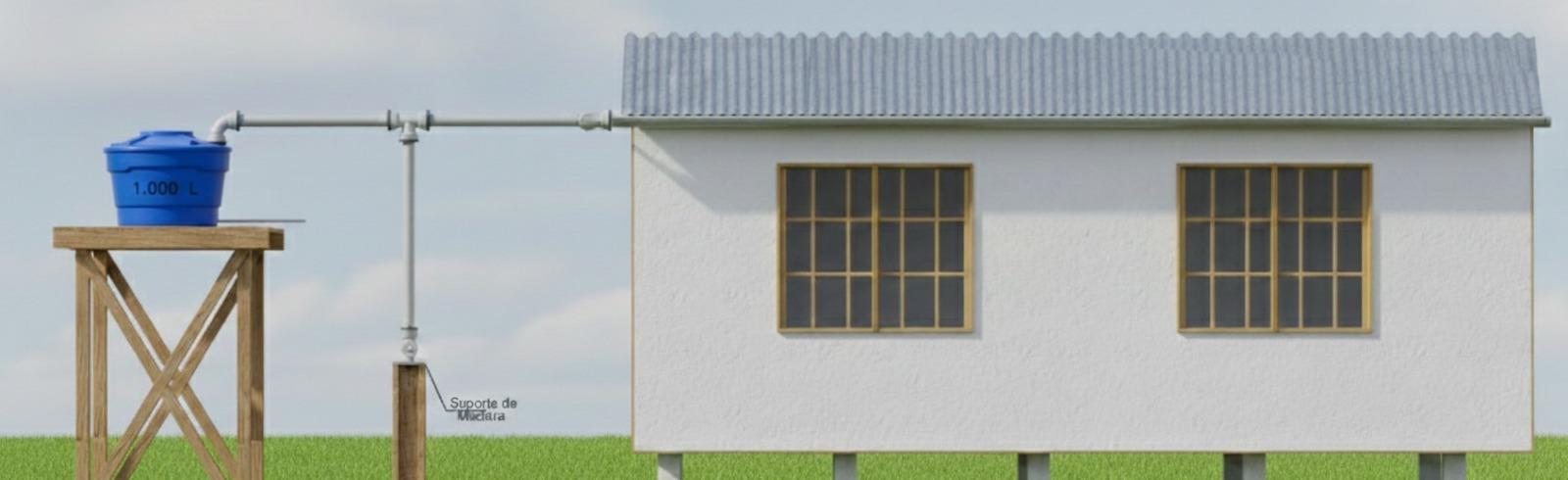A água da chuva captada é conduzida por gravidade, por meio de tubulação, até o ponto de uso instalado nas proximidades da residência.